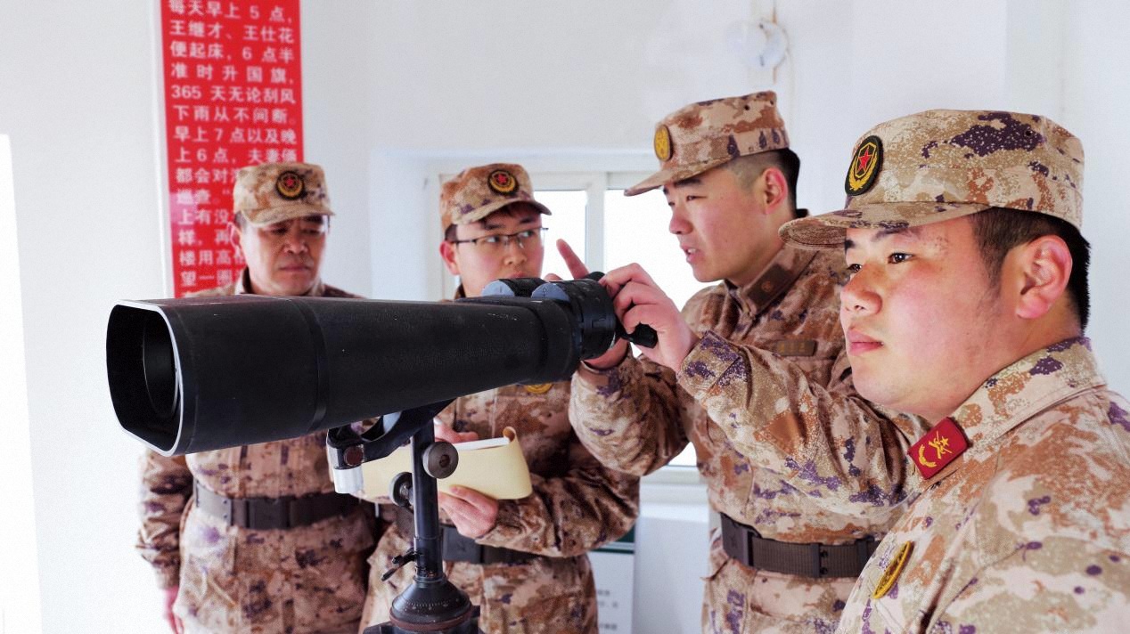 陈志显(右二)与哨所民兵正在瞭望观察海况。(摄影/张学彦)