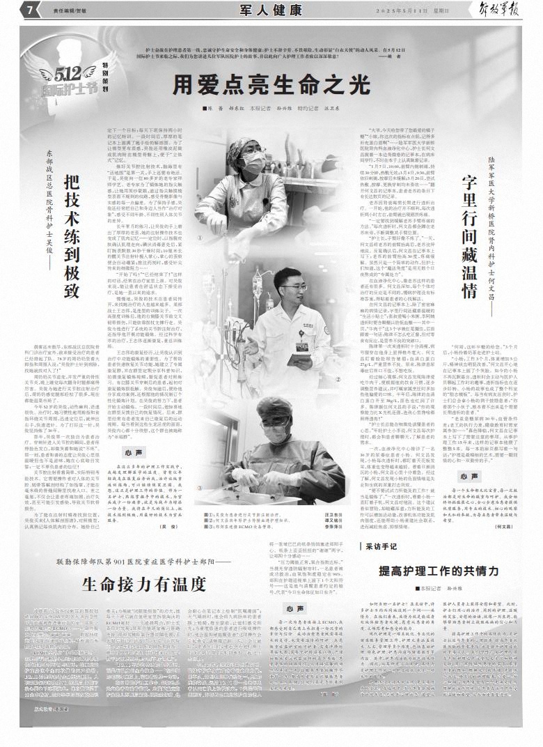 每一次为患者连接上ECMO,我都感受到自己肩上承担着一份沉重的责任与信任。成功治愈患者既需要技术的支撑,也需要温情的呵护。我愿做重症监护室的守护者,需要冲锋时勇猛无畏,需要守护时温柔以待,严谨细致地关注机器运转的每个参数、患者身体的细微变化,让连接设备的动作尽量快一点,让服务患者的操作尽量轻一点,努力用爱与关怀驱散患者的恐惧与孤独,让他们在危急时看到生机与希望。