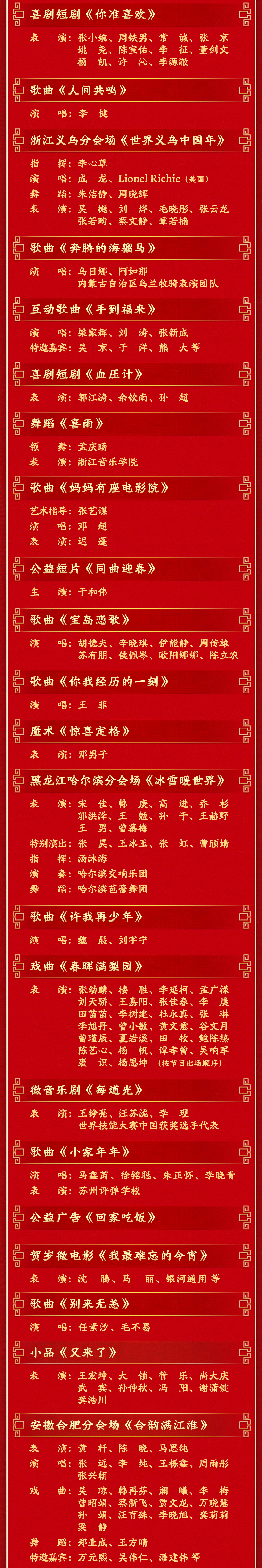 2月16日晚8点,中央广播电视总台《2026年春节联欢晚会》将在央视综合频道、综艺频道、中文国际频道、国防军事频道、戏曲频道、少儿频道、音乐频道(无障碍版)、农业农村频道、4K超高清频道、8K超高清频道等10个电视频道,中国之声、音乐之声、经典音乐广播、文艺之声、粤港澳大湾区之声、台海之声、华语环球广播、南海之声和中国交通广播等9个广播频率,以及央视新闻、央视频、云听客户端、央视网、央广网、国际在线等6个自有新媒体平台同步直播。