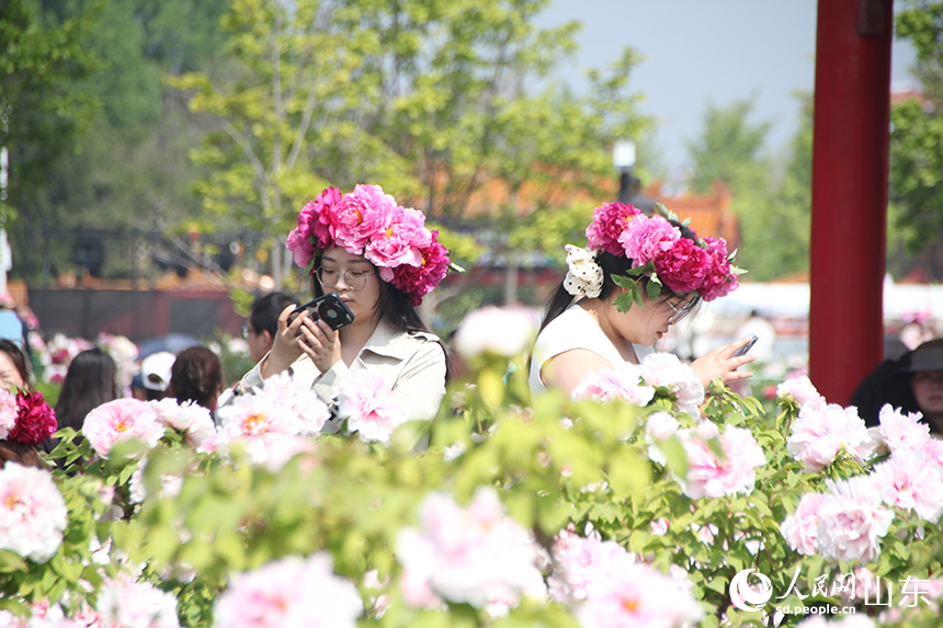 游客头戴牡丹花冠,纷纷拍照打卡。人民网记者 宋翠摄