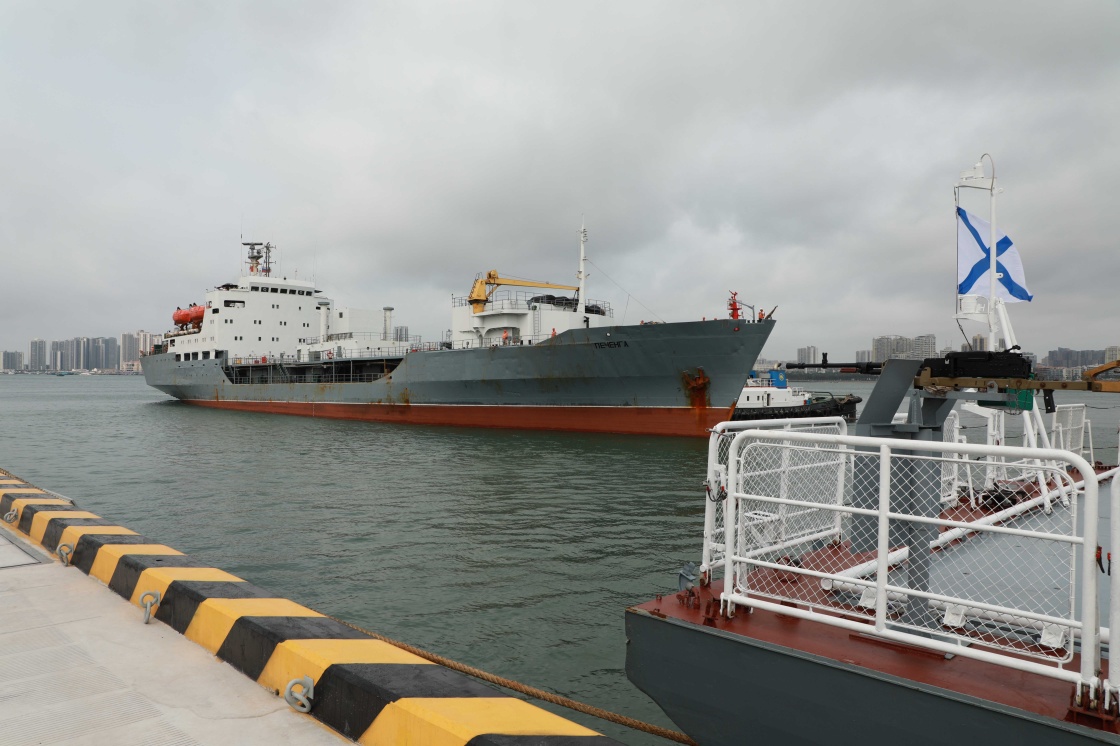 4月15日,俄罗斯海军“佩琴加”号中型油船靠泊湛江某军港码头。新华社记者 李秉宣 摄