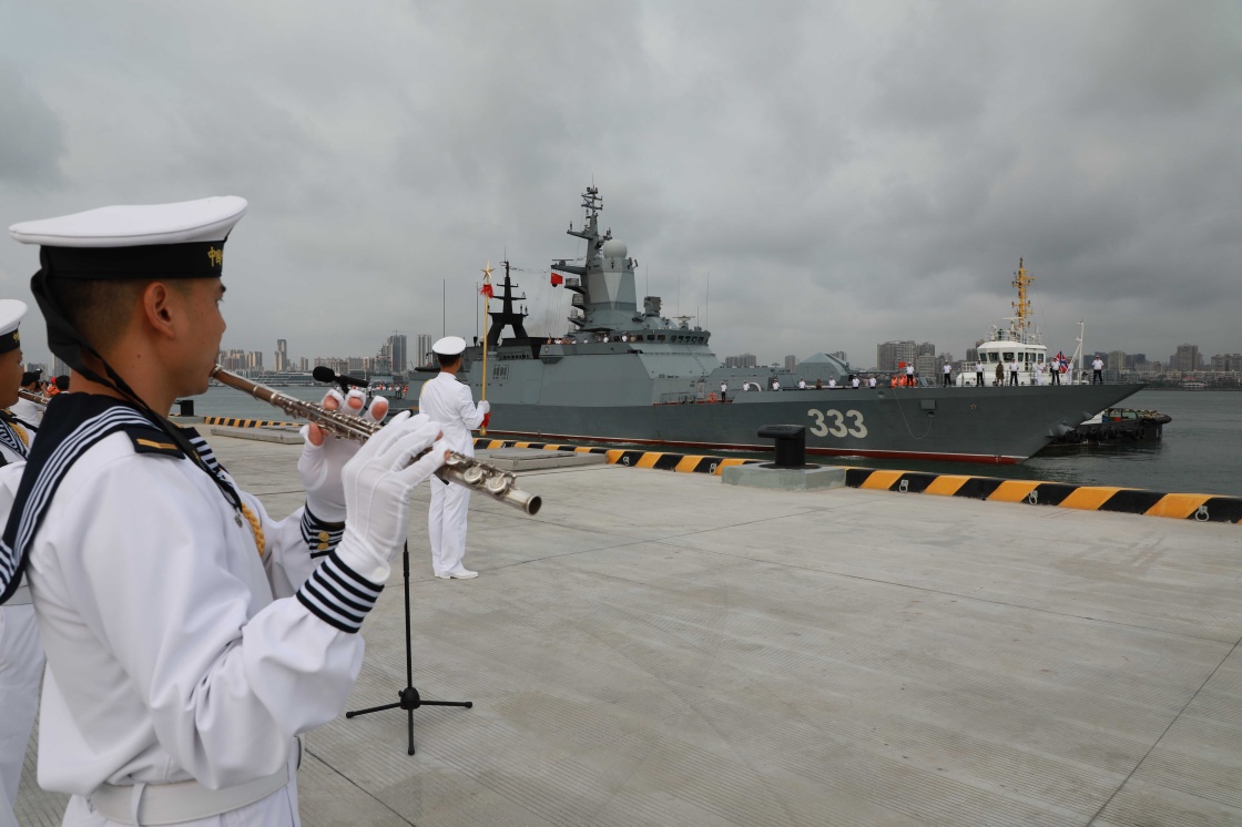 上午9时许,在中国海军郴州舰引导下,悬挂中俄两国国旗的俄海军舰艇编队,缓缓靠泊湛江某军港码头。中方在码头举行了欢迎仪式。