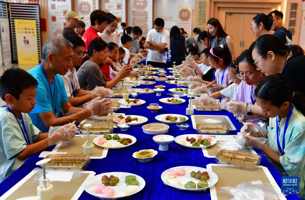 10月6日,在江苏省江阴市新时代文明实践中心,小朋友和家长一起制作月饼。新华社发(还月亮摄)