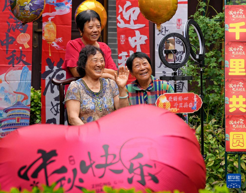 10月6日,在江苏省海安市墩头镇宝祥村“情满中秋 爱暖侨心”活动中,侨眷们与海外亲人视频连线。新华社发(周强摄)