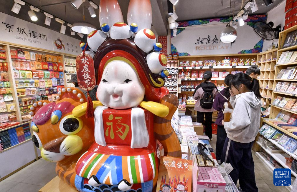 10月6日,游客在北京烟袋斜街的商店里选购北京兔儿爷文创产品。新华社记者 李欣 摄