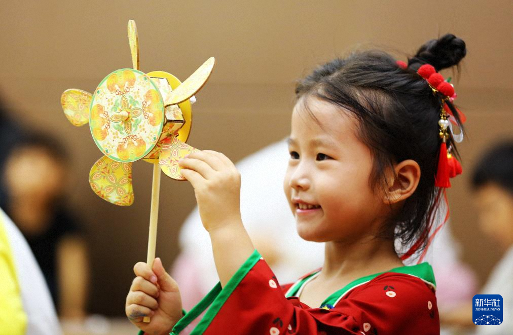 10月6日,在山东省滕州市博物馆,小朋友制作“风车转花灯”。新华社发(李志军摄)