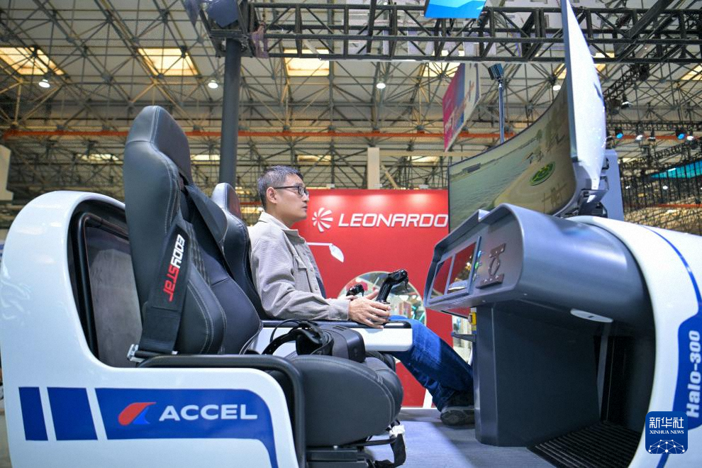 10月14日,工作人员在天津直博会直升机馆内调试模拟飞行体验设备。新华社记者 孙凡越 摄