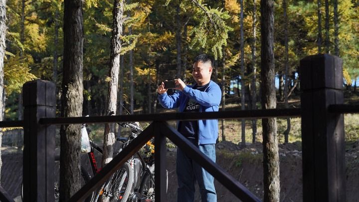 游客在右玉松涛园生态景区拍照(2025年10月14日摄)。新华社发(裴元新 摄)