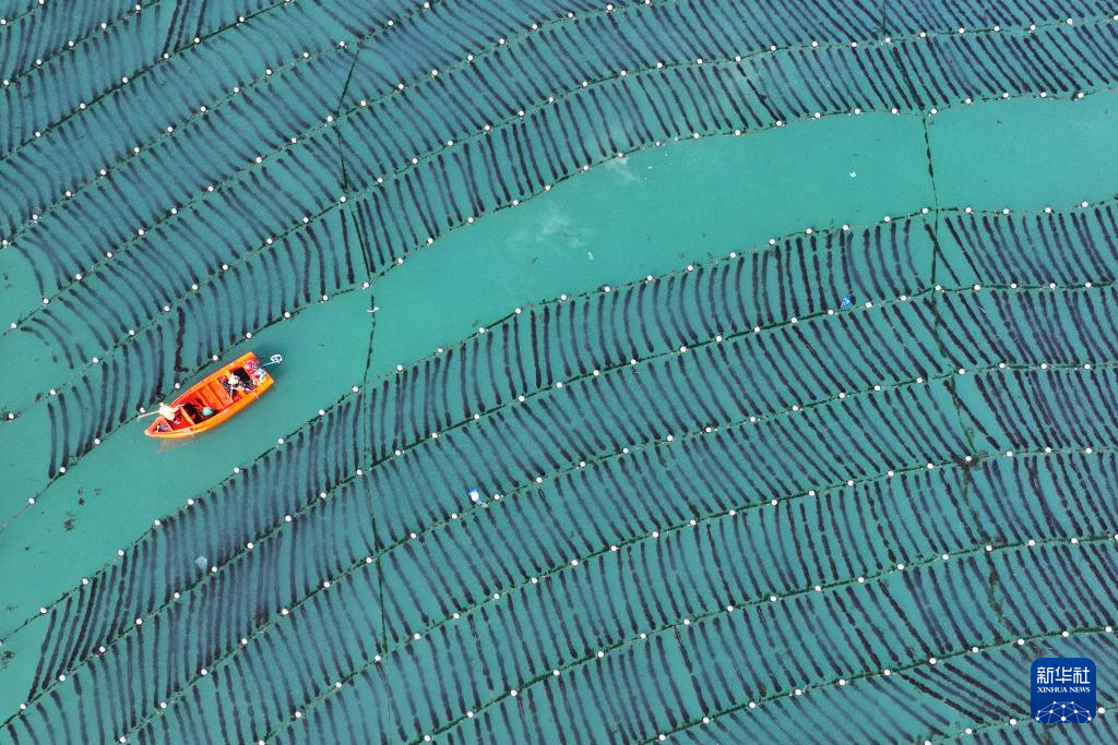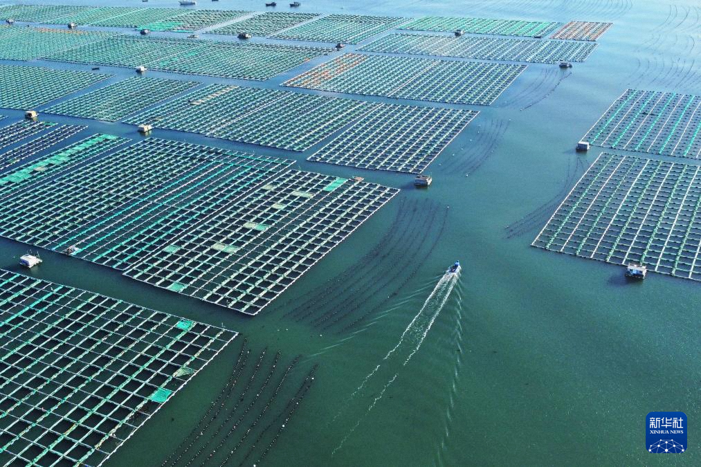 11月10日,在山东省荣成市桑沟湾海洋牧场,养殖工人在养殖区穿梭作业(无人机照片)。新华社发(王福东 摄)
