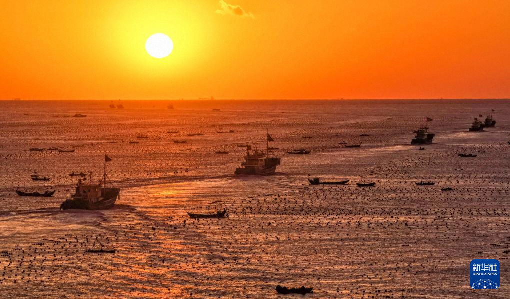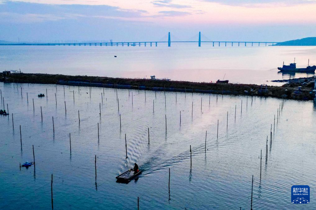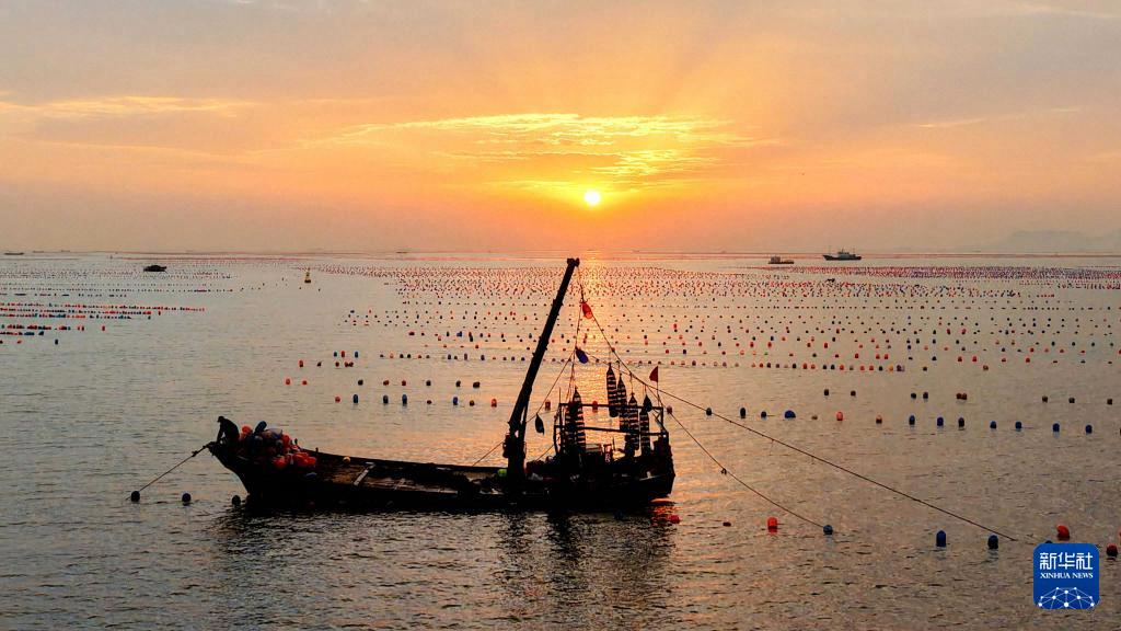 11月11日,在山东青岛西海岸新区海域,养殖户在收获牡蛎和扇贝(无人机照片)。新华社发(俞方平 摄)
