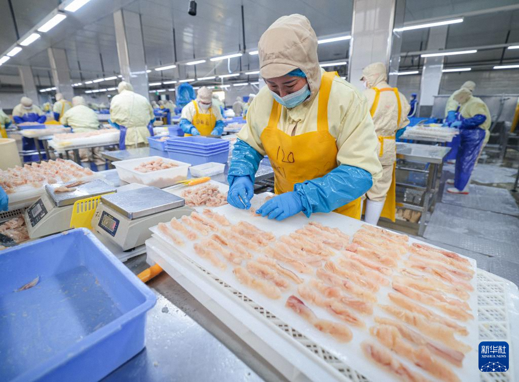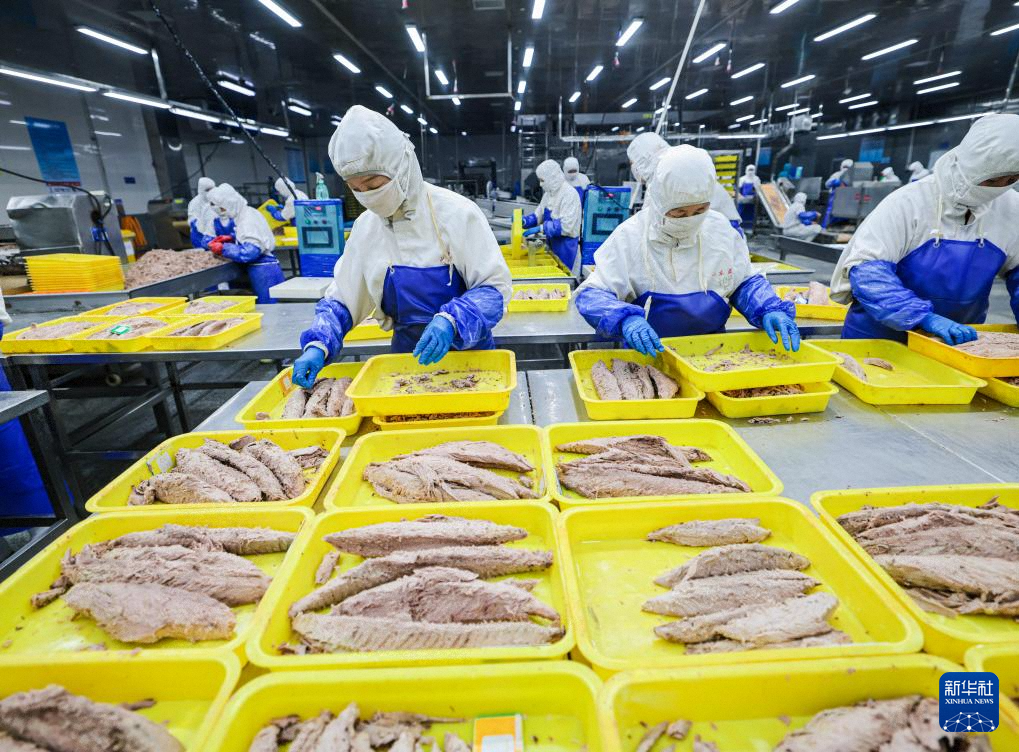 11月10日,山东省荣成市俚岛镇一家水产品加工企业的工人在加工鳕鱼制品。新华社发(李信君 摄)