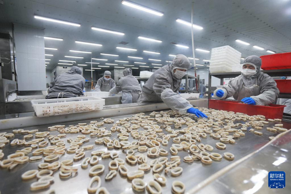 11月10日,山东省荣成市一家海洋食品加工企业的工人在加工鱿鱼产品。新华社发(王福东 摄)