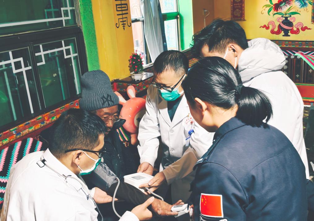 11月6日,普玛江塘边境派出所民警与湖南省援藏医生江志超、赵启等一同到牧民家中义诊。新华社记者任沁沁摄
