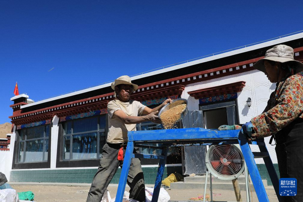 西藏定日县曲洛乡措昂村村民旦增(左)在自家新房院子里加工收获的青稞(10月24日摄)。