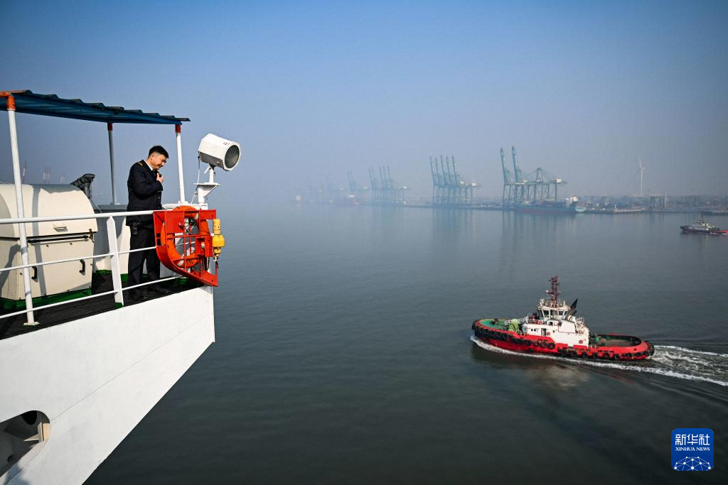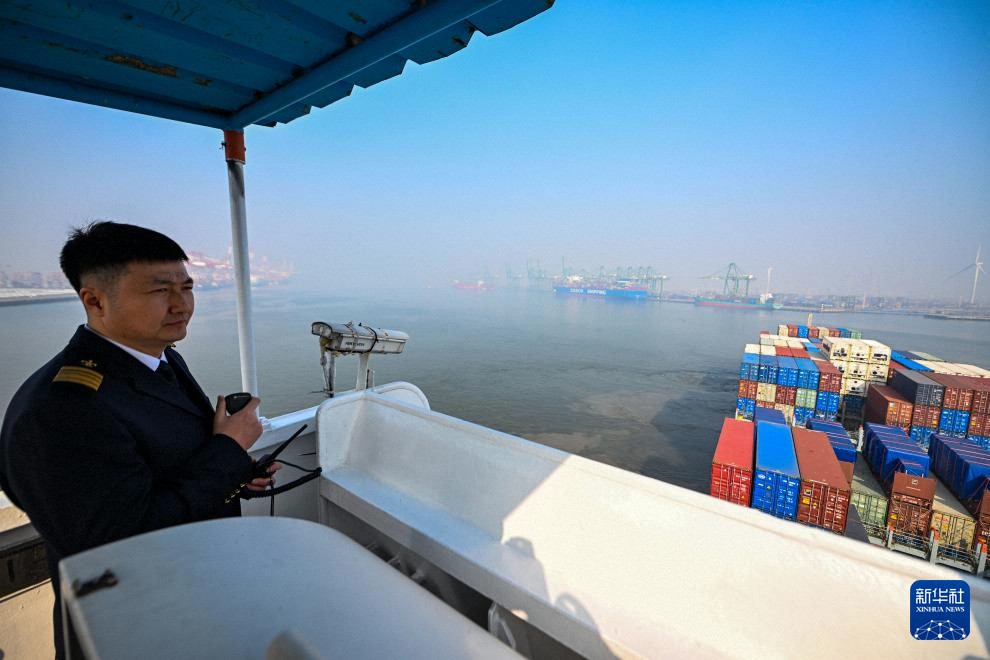 2月4日,天津港引航中心引航员孙勃在“中远海法”轮上指挥货轮进行离泊作业。新华社记者 赵子硕 摄