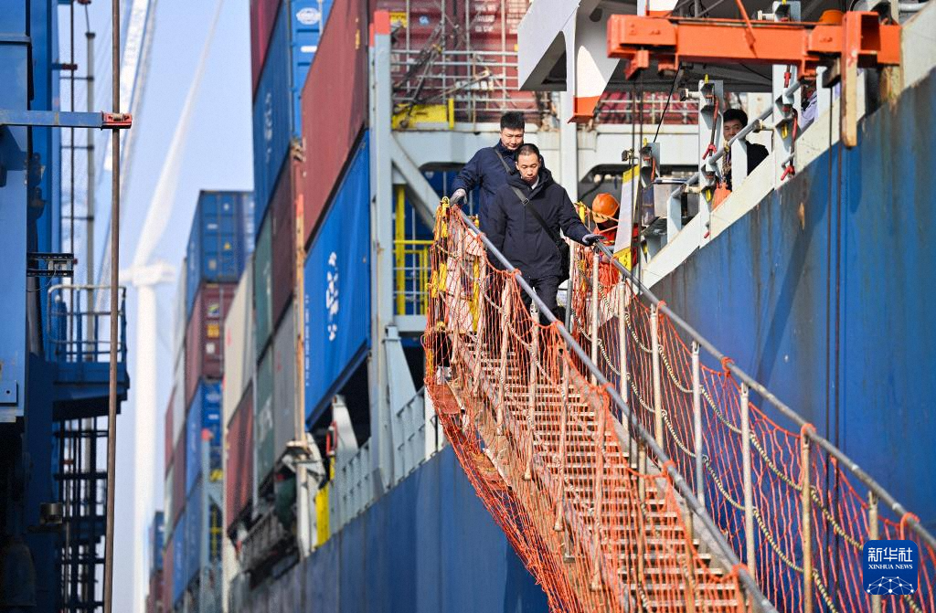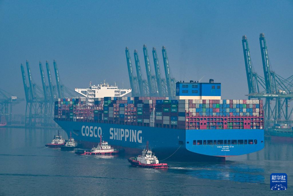 2月4日,一艘集装箱货轮准备靠泊在天津港集装箱码头。新华社记者 赵子硕 摄
