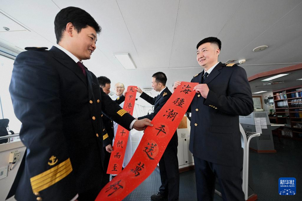 2月4日,天津港引航中心引航员孙勃(右)在“中远海法”轮上向船长赠送春联。新华社记者 赵子硕 摄