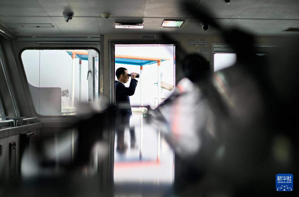 2月4日,天津港引航中心引航员许钦平在“中远海法”轮上通过望远镜查看航道。新华社记者 赵子硕 摄