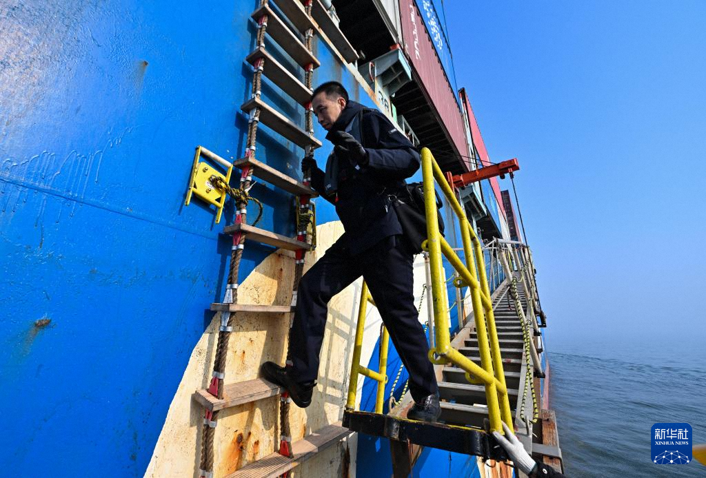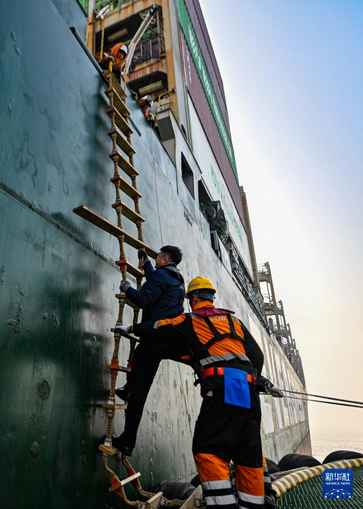 2月4日,在天津港锚地,天津港引航中心引航员孙勃攀爬软梯,他将在登船后引航该船入港。新华社记者 赵子硕 摄