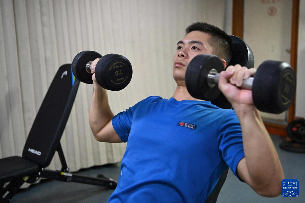 2月11日,中国海警万山舰执法员王弘在休息时间锻炼身体。新华社发(翟一凡摄)