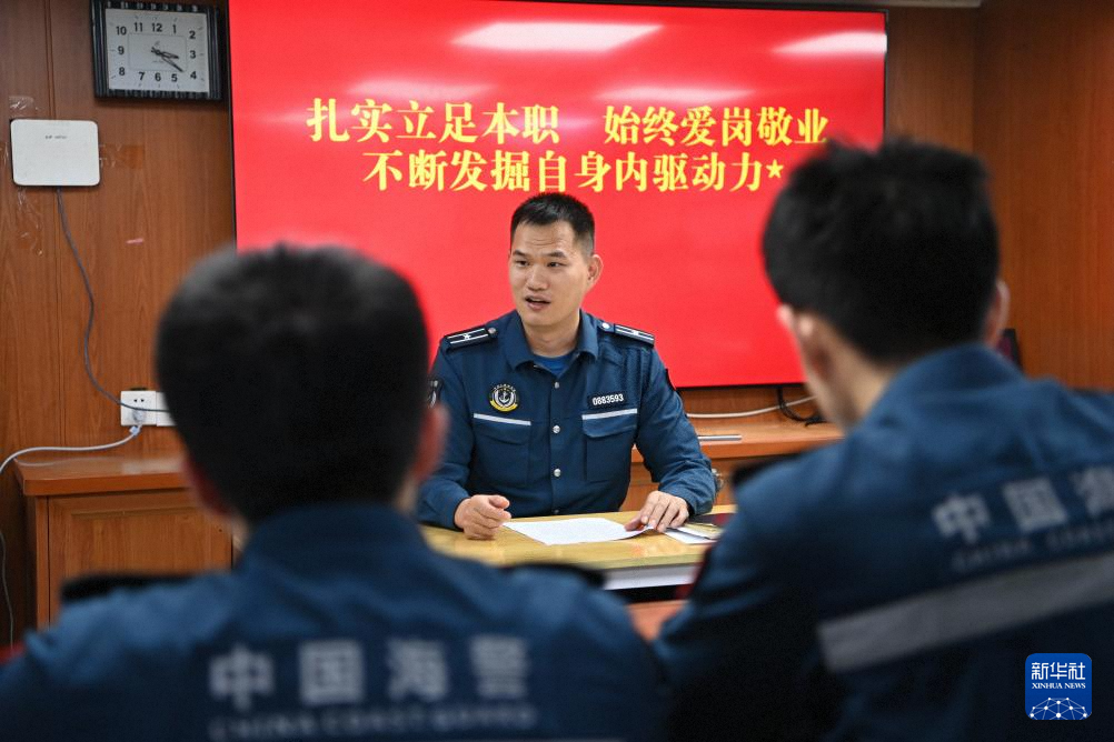 2月10日,中国海警万山舰执法员陈晨(中)在对舰员们开展每周的思想政治教育。新华社发(翟一凡摄)