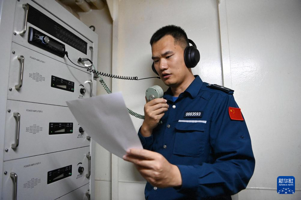 2月10日,中国海警万山舰执法员陈晨在进行每日的“万山之声”广播。新华社发(翟一凡摄)