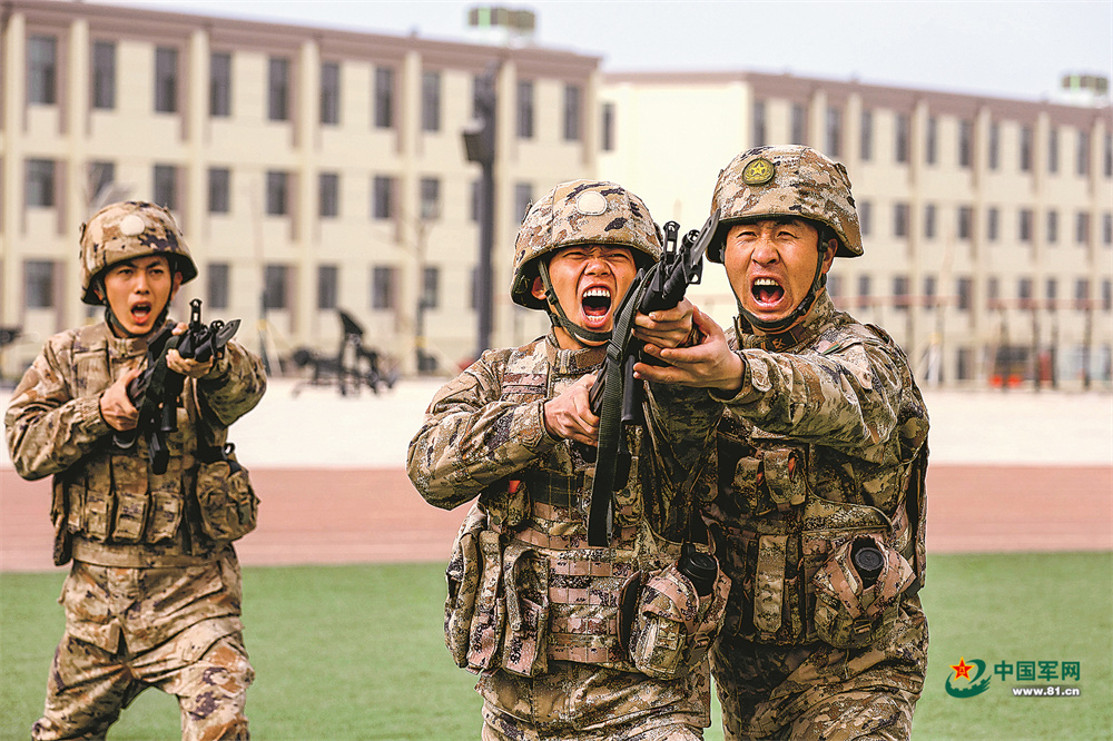 近日,武警某部新兵训练团组织小比武、小竞赛。图为新兵吴祉进(左前)与班长进行比拼。孟令照摄
