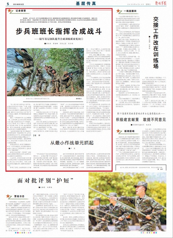 当然,单元集成重在“集成”,一个作战单元即使再小,也要同时做好内部协同和上下融合。只有练强班组这一级,由班至连、由连至营、由营至旅乃至跨军兵种的逐级合成才会成为可能。在此过程中,类似步兵班班长徐雪江遇到的问题会不断出现,唯有创新思路举措、脚踏实地攻关,一个个解决遇到的难题,才能真正跨过走向联战联训的沟坎。