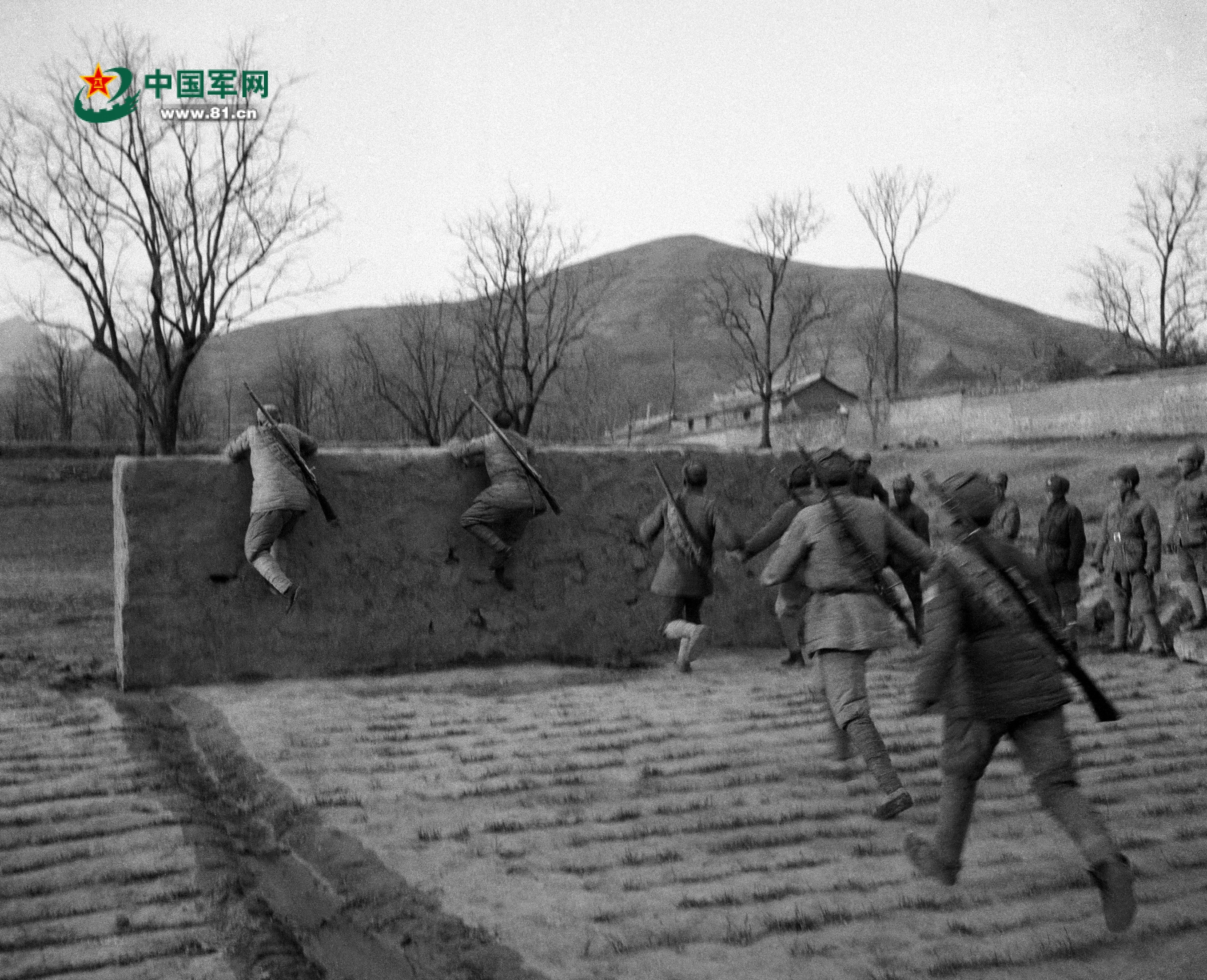 八路军晋察冀某部开展翻越障碍训练。