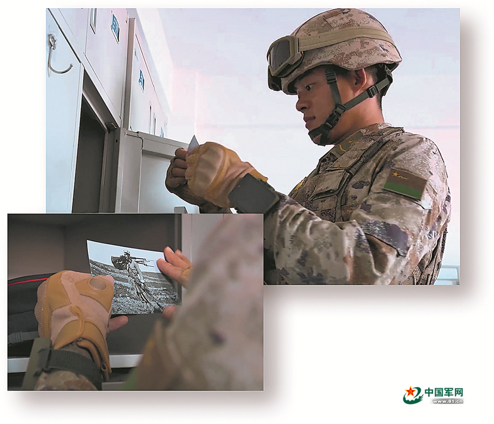 战旗方队受阅官兵、第79集团军某旅“红五连”战士赵畦凝视着老连长李永生的照片。作者供图