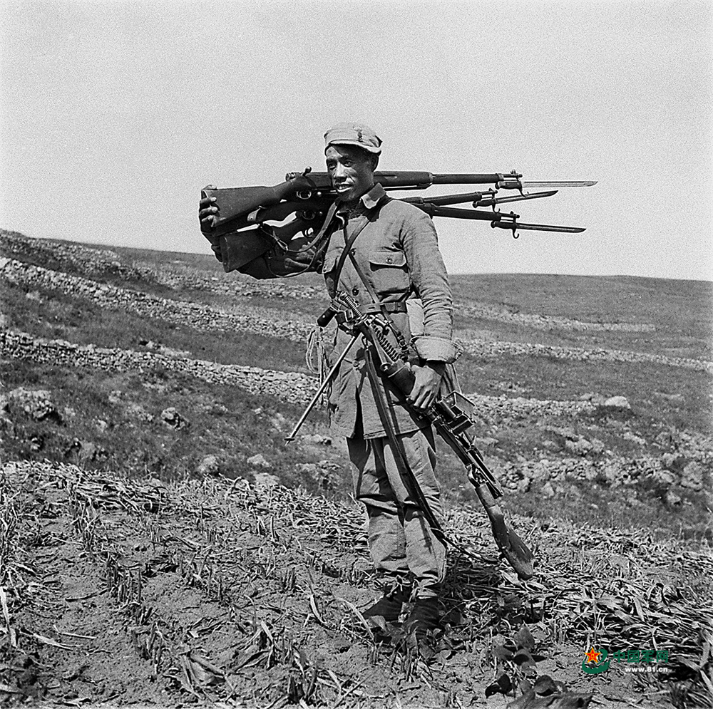 照片上,这位八路军肩扛三支“三八大盖”,手里还提着一挺轻机枪。据了解,日军的“三八大盖”加上刺刀长度超过了一米七。由此推测,他的身高起码有一米九,在身材矮小的日本鬼子面前,他完全是一副“战神”的形象。