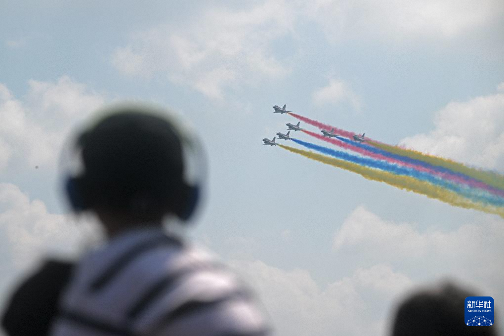 2月7日,在新加坡樟宜展览中心,观众观看中国空军八一飞行表演队的飞行表演。新华社发(邓智炜摄)