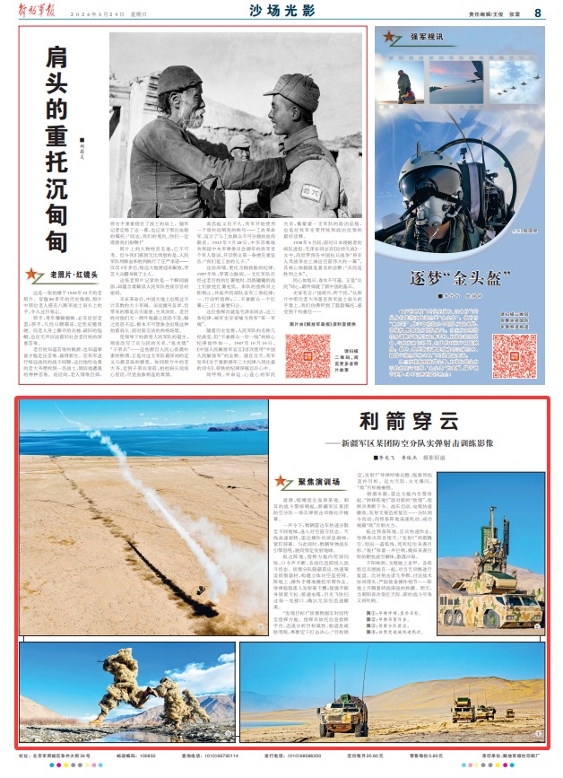 抵达预备阵地,官兵快速作业,导弹再次昂首指天。“发射!”利箭腾空,划出一道弧线,死死咬住来袭目标。“轰!”伴着一声巨响,模拟来袭目标的靶机凌空解体,散落沙海。