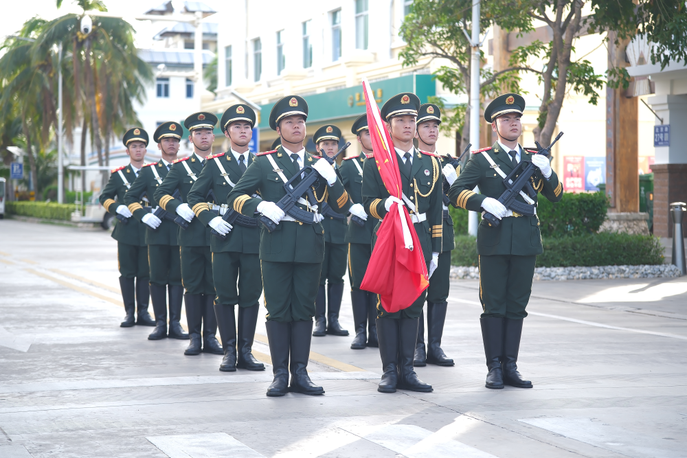 三沙市政府广场上,工作人员、驻岛官兵、岛上居民整齐列队,神情肃穆。