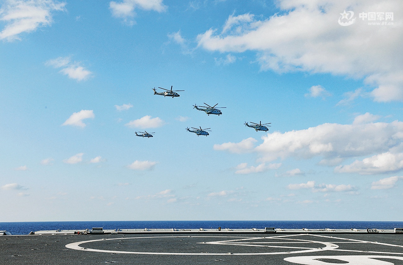 【每天一张新壁纸 “换”醒战斗力】海军某支队舰艇编队奔赴某海域开展多科目综合训练,图为舰载直升机飞赴训练空域。
