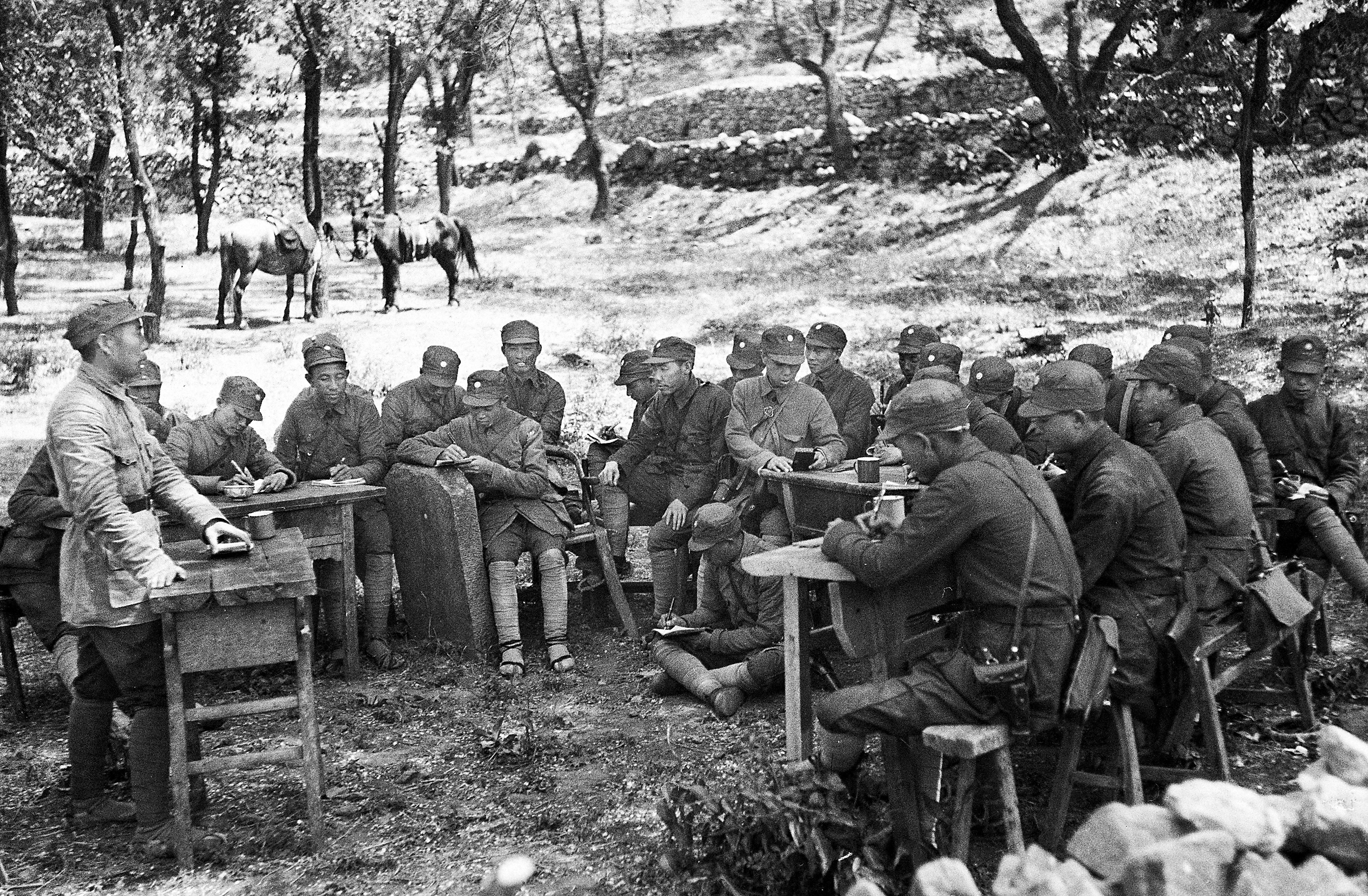 1939年12月,国民党反动派军队进犯陕甘宁边区,八路军359旅旅长王震(左侧站立者)召集干部会议,动员部署保卫党中央。
