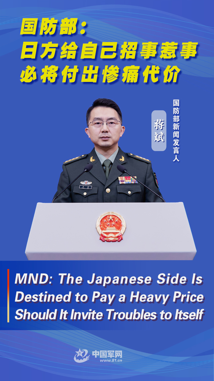 蒋斌:台湾问题纯属中国内政,如何解决台湾问题是中国人自己的事,根本不关日本什么事。今年是台湾光复80周年,日本不仅不深刻反省侵略殖民台湾的严重罪行,反而冒天下之大不韪,妄想军事介入台海,颠覆战后国际秩序,重蹈军国主义覆辙。解放军有强大的能力、可靠的手段打败一切来犯之敌,日方胆敢越雷池半步给自己招事惹事,必将付出惨痛代价。