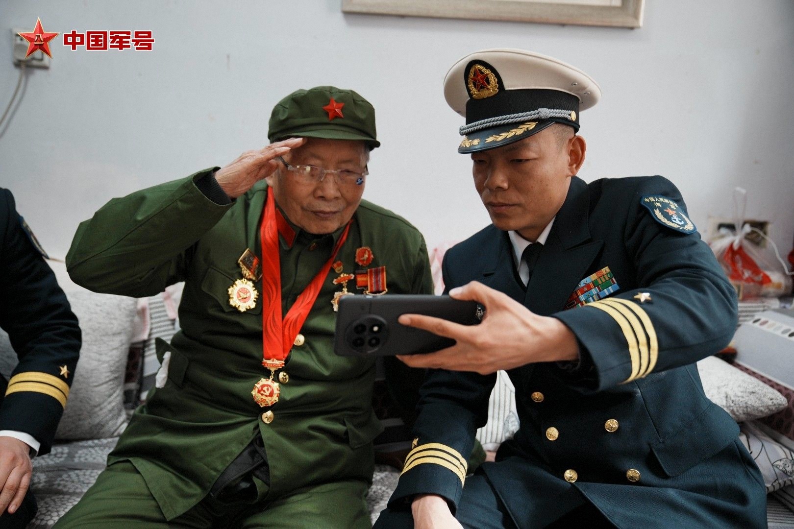 说话间,位于营区的官兵打来了视频电话,视频里的官兵整齐列队、精神昂扬,齐声向朱志学致以新春祝福。看着屏幕中朝气蓬勃的年轻战友,看着熟悉的荣誉旗帜,老人眼眶微微湿润,他挺直腰板,敬了个标准的军礼,并和连队官兵约定:“我知道,今年是咱们‘冲山阻击营’授称80周年,身体允许的话,我想回到咱们老部队看看。”他用略显颤抖的声音嘱托道:“你们要牢记,听党指挥,熟练手中武器,提高军事技能,守护好咱们的家国安宁……”