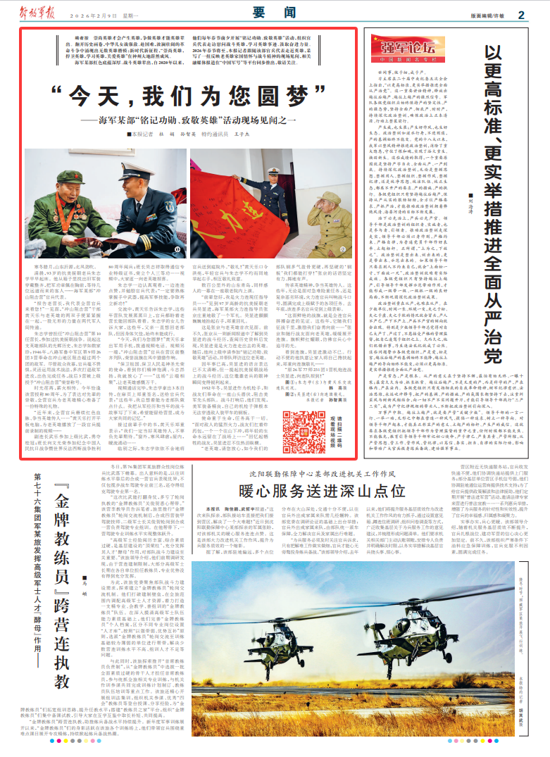 海军某部红色底蕴深厚、战斗英雄辈出,自2020年以来,他们每年春节前夕开展“铭记功勋、致敬英雄”活动,组织官兵代表走访慰问战斗英雄,学习英雄事迹、汲取奋进力量。2026年春节将至,解放军报记者跟随该部官兵代表走近英雄,采写了一组反映老英雄家国情怀与战斗精神的现场见闻,相关融媒体报道在“中国军号”等平台同步推出,敬请关注。