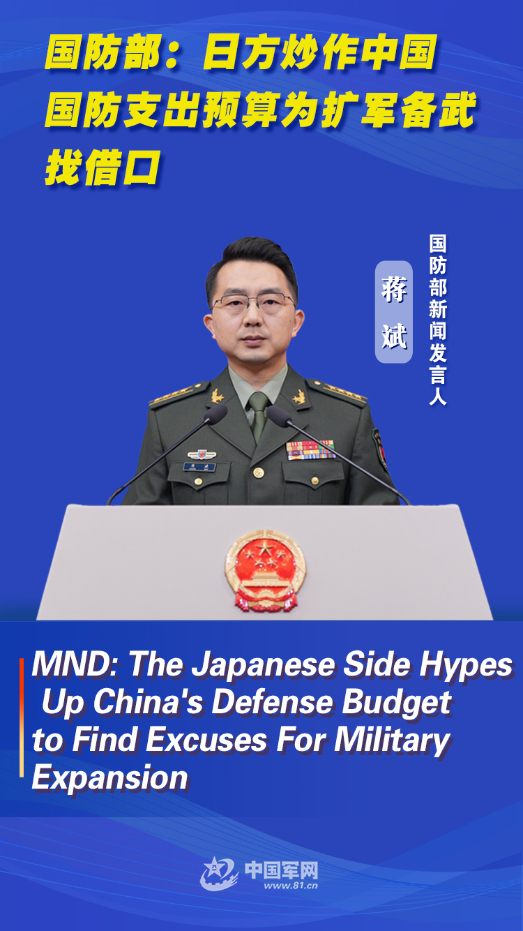 日本有关政客炒作中国国防支出预算和所谓“中国威胁”,明显是贼喊捉贼,为日方扩军备武的狼子野心找借口。基于日本的侵略历史,《开罗宣言》《波茨坦公告》和《日本投降书》等一系列具有充分国际法效力的文件明确规定,日本应完全解除武装,不得维持能使其重新武装的产业。需要指出的是,日本防卫预算连续14年增长,近5年来增幅超过60%,防卫支出GDP占比达到2%,国民人均防卫费是中国的3倍多。日方极力突破“和平宪法”束缚,远远超出“专守防卫”范畴发展部署进攻性武器装备,背着尚未清算的侵略罪责谋求“再军事化”,这才是对地区和平稳定的真正威胁。我们敦促日方多照照镜子,停止颠倒黑白的污蔑抹黑,不要再次走上军国主义的不归路。