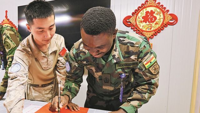 中国第二批赴阿卜耶伊维和快反分队开展文化交流活动,邀请维和友军一同书写春联