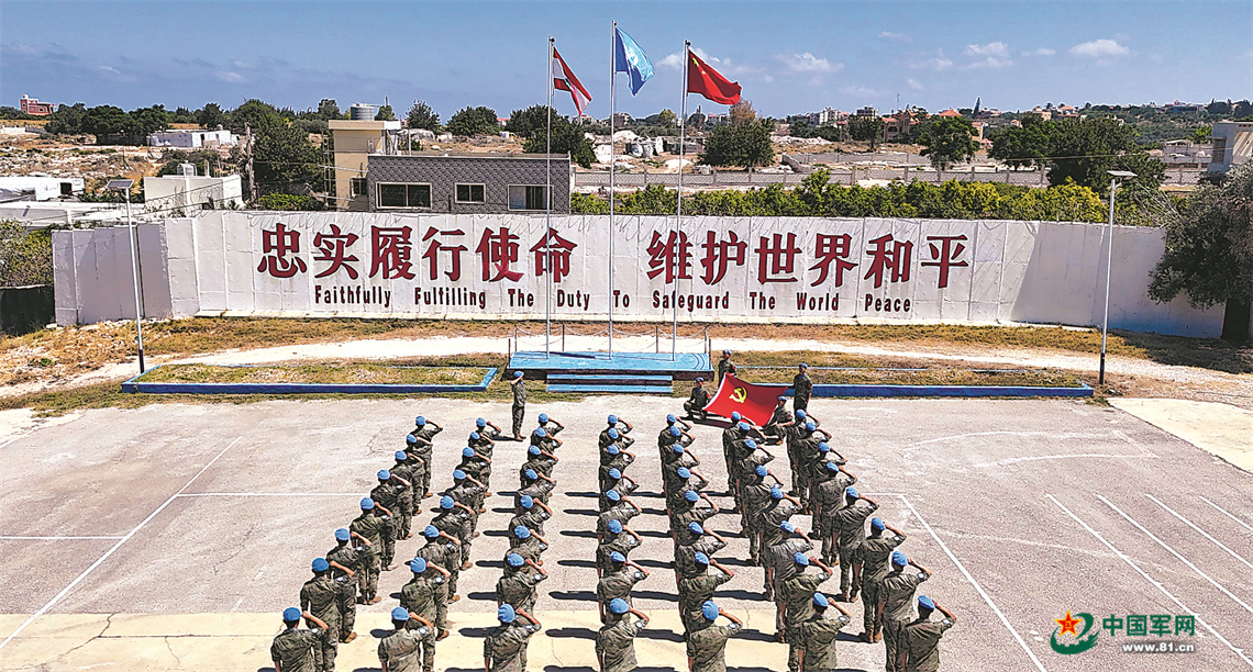 “七一”前夕,我第23批赴黎巴嫩维和部队组织党员骨干在营区面对党旗重温入党誓词,强化官兵使命意识。张博禹摄
