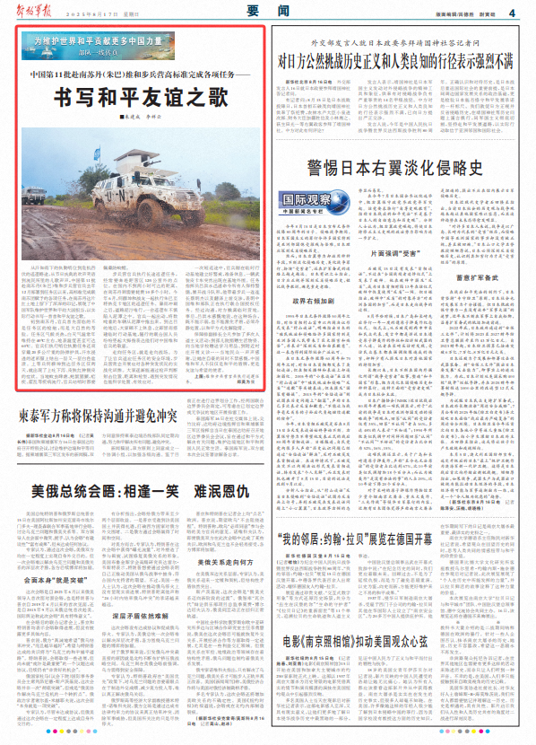 从汗如雨下的执勤哨位到危机四伏的巡逻路途,从节日庆典的欢声笑语到流民所里的儿歌声声,中国第11批赴南苏丹(朱巴)维和步兵营官兵去年12月部署到任务区以来,高标准完成联南苏团赋予的各项任务,在南苏丹这片红土地上留下了深深的印记,展现了中国军队维护世界和平的大国担当,以实际行动书写一首首和平友谊之歌。