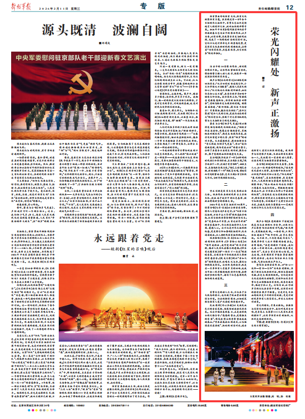强军事业呼唤强军文化,强军文化凝聚强军力量。在实现建军一百年奋斗目标的伟大征程中,军事文艺始终是铸魂育人的精神火炬、砥砺血性的冲锋号角。2026年中央军委慰问驻京部队老干部迎新春文艺演出中的歌曲作品,以声为舟、以情为楫,承载厚重历史与时代脉搏,完成了一场跨越时空的深情对话。它们不仅是对革命先辈的崇高礼赞,更是强军文化在新时代的璀璨绽放,诠释着“为强军服务、为基层服务、为官兵服务”的使命担当。
