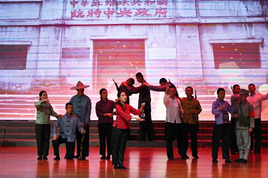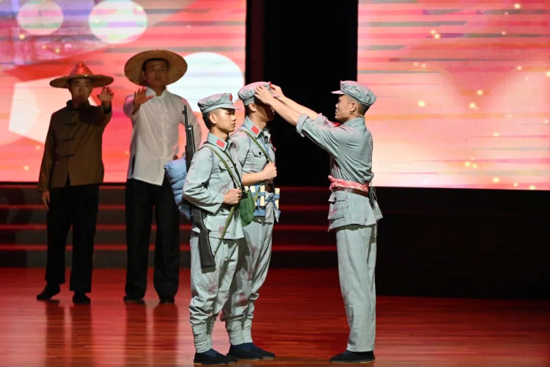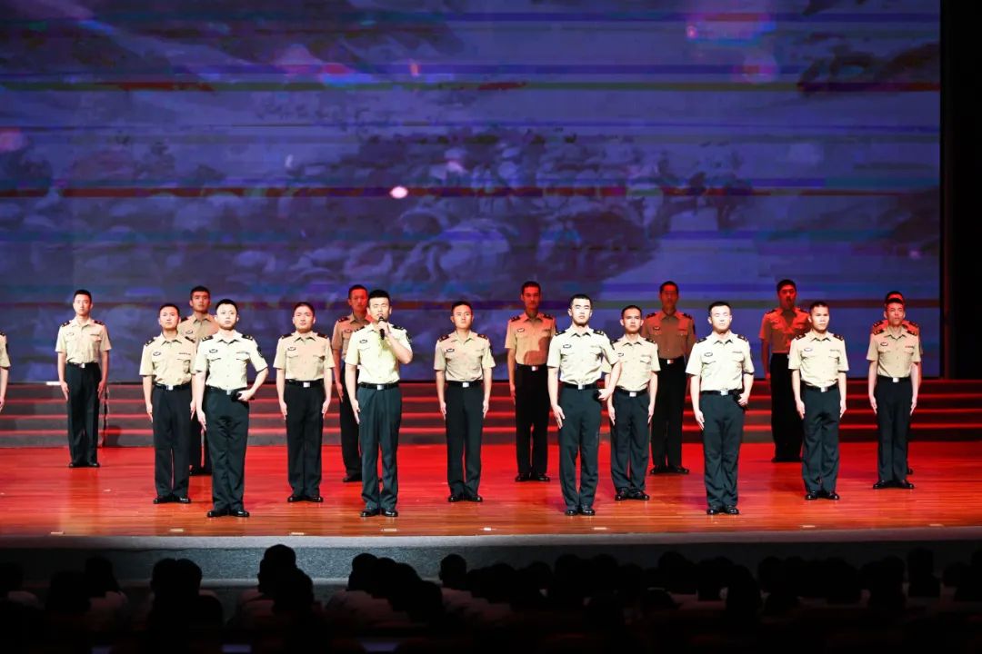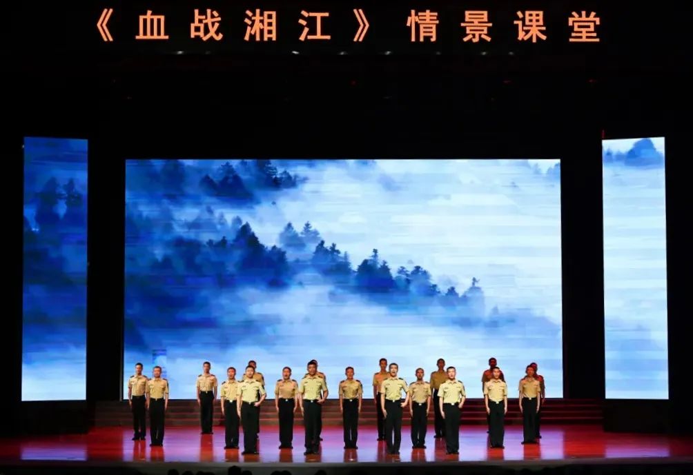 官兵登台演出原创节目情景朗诵《湘江之歌》、《湘江肃穆颂英灵》及短剧《钢铁的意志》。在硝烟场景中,再现了红军指挥员陈树湘断肠明志的壮烈事迹。