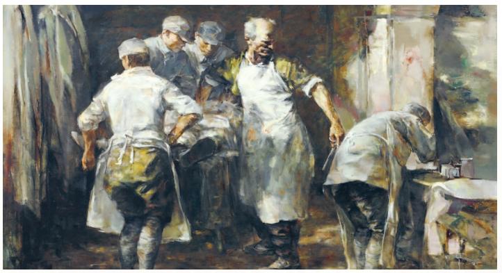 2015年,我受中国人民革命军事博物馆之邀,用画笔再现了那个刻骨铭心的时刻——1939年深秋,白求恩在河北涞源的一座小庙里,为伤员做完最后一台手术。创作《战火中的白求恩》这幅油画时,我仿佛置身于那座摇摇欲坠的小庙,硝烟刺痛双眼,爆炸声震耳欲聋。但我的眼前,始终有一个挺拔的身影。他明知危险,却依然用生命践行着医者誓言。我想,这幅作品不仅凝固了历史,更让观者感受到超越时空的精神力量。