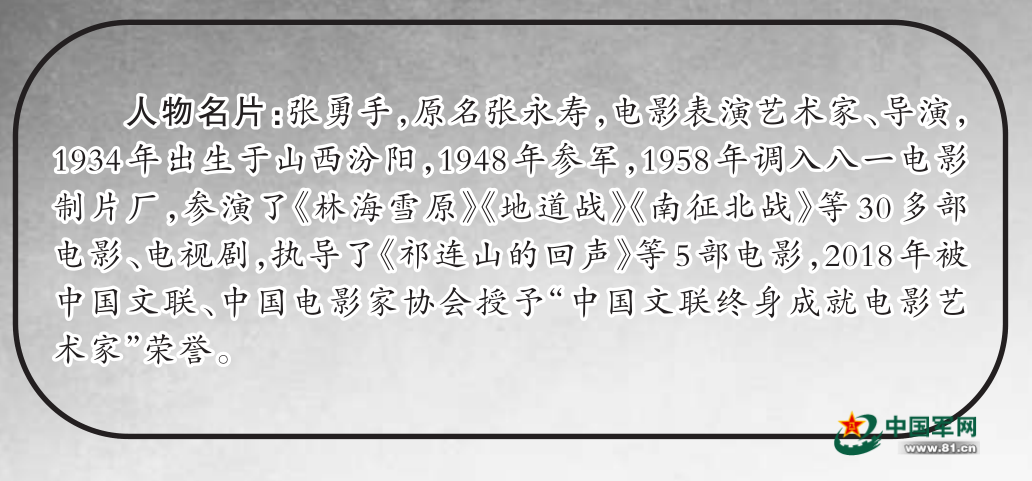 张勇手:1956年,八一厂因拍摄电影《柳堡的故事》,来60军文工团选演员,让我和一位女同志表演一个小品,就是二妹子和副班长的一段情节,拍了一些照片就走了。我并没有当回事,很快就忘了。没想到,过了一段时间八一厂寄来一本厚厚的剧本,叫《最后一个冬天》,就是后来的《黑山阻击战》,让我看一下剧本里的连长王海龙。那时,我只看过两部电影,可以说对电影一窍不通,以为拍电影跟平时唱歌跳舞差不多。我就以懵懵懂懂的状态去八一厂试镜,在那里遇到了自己的第一位伯乐——刘沛然导演。