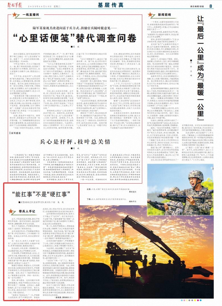 “交任务”不再一“交”了之。做法一变,效果很快显现。战士郑国劲军事素质比较突出,但组织能力较弱。为此,我特意安排他牵头组织部分基础训练,鼓励他积累带队经验。在他组训过程中,我还会根据他的表现及时指出问题,提出改进建议。此外,我安排经验丰富的班长与他结对,帮助他熟悉日常工作。如今,郑国劲不仅走上了班长岗位,还带领全班战友在最近考核中取得了全优成绩。