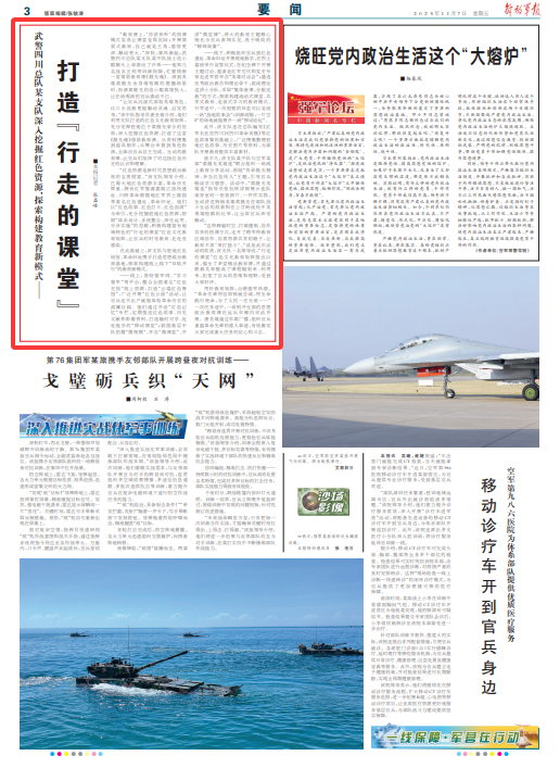 ——线下,积极组织官兵到红色遗址、革命旧址开展现地教学,在烈士墓前举行宣誓仪式,在纪念碑下开展主题讨论,邀请老红军后代和党史专家走进军营举办“英雄对话会”;遴选优秀政治教员和理论骨干,组成理论巡讲小分队,采取“集体备课、分散送教”的方式,探索构建流动式课堂、共享式教育、走读式学习的教育模式。行军途中,一次短暂的休息可以变成一场“战地故事会”;训练间隙,一片空旷的场地就能展开一场“移动论坛”。