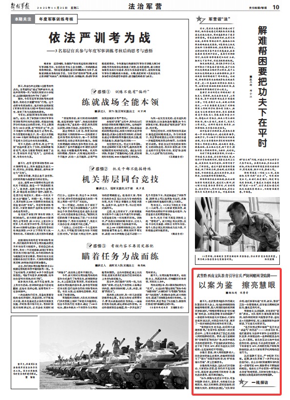 小张的现身说法,让战友们深受触动,大家更加清楚,自我约束不是空洞口号,而是要通过持续不断的学习,强化法治思维,提升辨识能力。